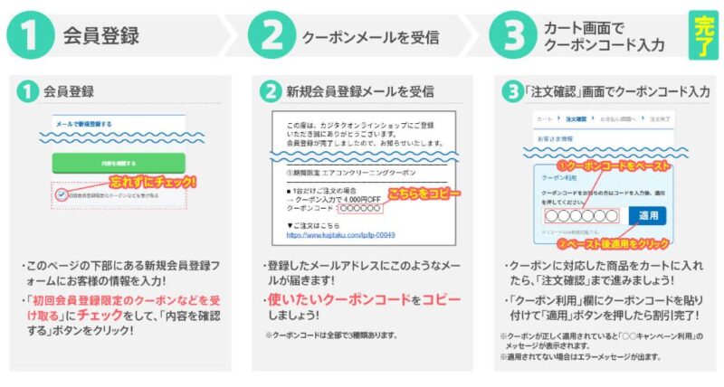 上記が、カジタクで実施中のエアコンクリーニングのキャンペーンやクーポンの利用方法です。