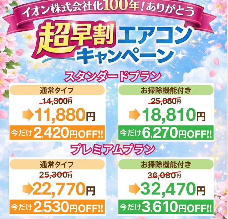 | 超早割エアコンキャンペーン | 通常タイプ2,420円オフ! 14,300円(税込)→11,880円(税込) お掃除機能つき6,270円オフ! 25,080円(税込)→18,810円(税込) |